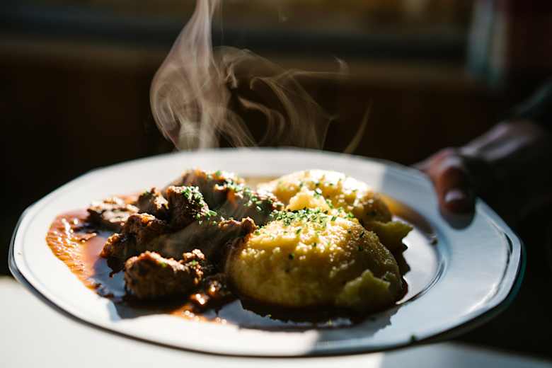 Deftiges Essen für hungrige Gäste – ein Teller dampfendes Gulasch. Foto: Elias Holzknecht, Bergwelten Magazin 02/2017