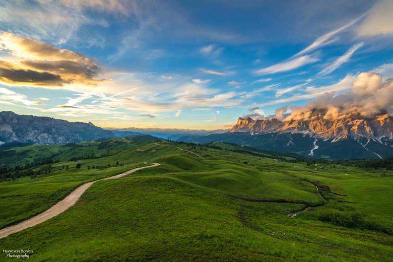 Besonders schön ist die Wanderung im Frühsommer, wenn die vielfältige Alpenflora in allen Farben vor dem schneeweißen Hintergrund der Marmolada und der Sellagruppe leuchtet.