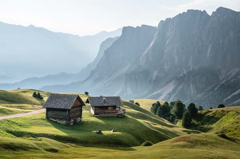 Auf dem Rückweg hat man das gesamte Campilltal vor Augen. In den welligen Almwiesen liegen wie getupft unzählige Scheunen und die Ütia Ciampcios, die zur Einkehr einlädt.