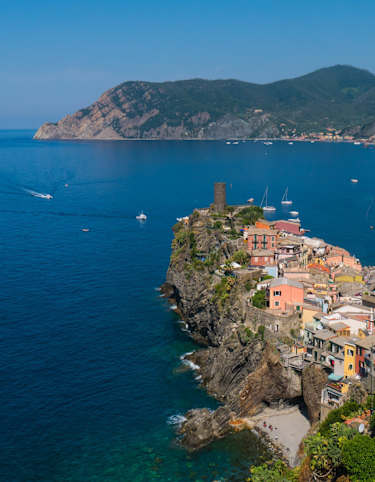 Vom Touristenhafen von Vernazza steigt man entlang einer „Arpaia“, der typischen steilen Treppe dieser Dörfer, in Richtung des mittelalterlichen Aussichtsturmes, der den Ort überragt. und in dessen Nähe der Blaue Wanderweg wieder beginnt (Markierung 592-2 ehem. SVA2).