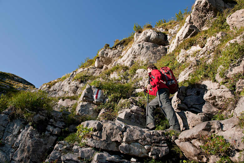 Zwischen Felsbändern windet sich der Bergwanderweg nun steil empor und führt am Ende über den breiten Bergrücken zum Gipfel des Schibenstoll (2.234 m).