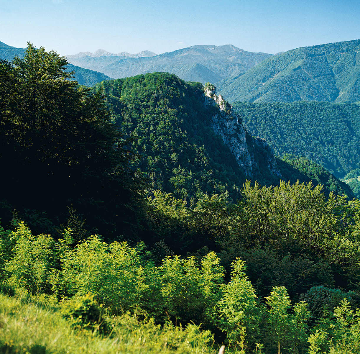 Man folgt aber dem bez. Hauptweg rechts über den bewaldeten Westkamm stetig bergan unter einen gratartigen Aufschwung: Über Felsstufen nach rechts, dort unter der lang gestreckten Gratwand steil bergauf und wieder zurück an den Waldrücken. Über ihn, Felsaufschwünge rechts umgehend, zur Schulter vor dem zweiten Felsaufschwung.
