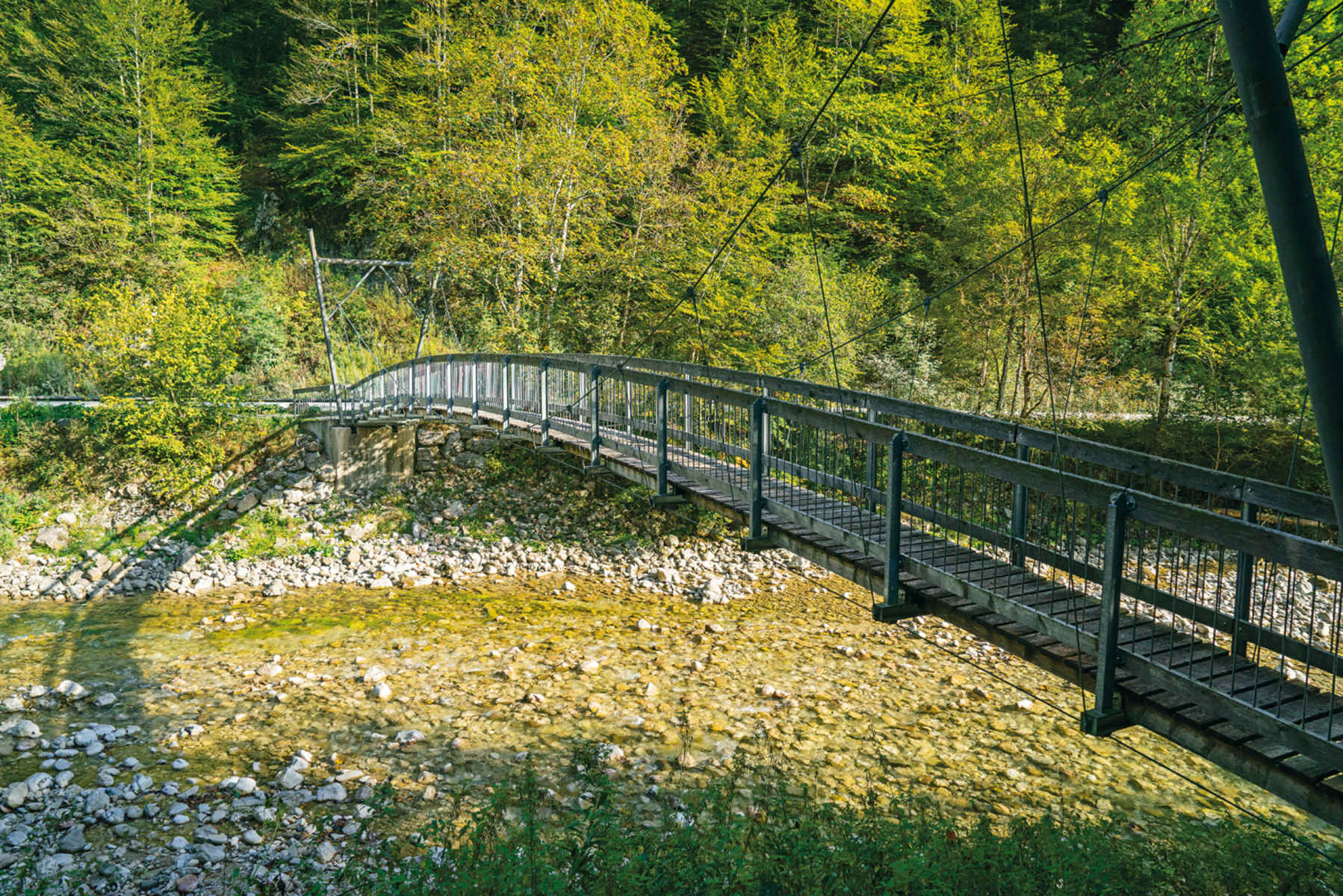 Vom Parkplatz Anzenbachschranken die Forststraße (einst Waldbahntrasse) südwärts über die Anzenbachbrücke zur Verzweigung danach. Links ab und auf den Wildnistrail Buchensteig an Waldhängen in Südrichtung talein und wieder zur Straße. Mithilfe der Hängebrücke über den Reichramingbach an das rechte Ufer.
