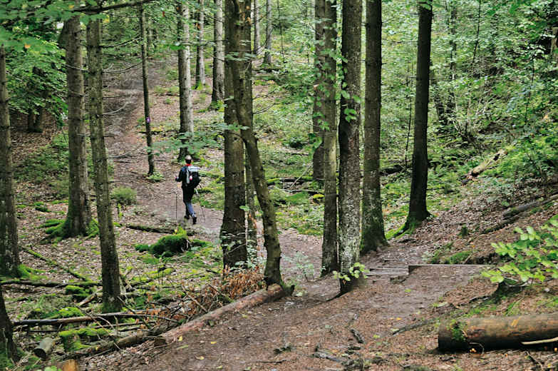 Diese Einladung wird man vermutlich gerne annehmen, denn bald folgt die nächste größere Steigung dieser langen Etappe. Von der Kneippanlage erreicht man in wenigen Schritten eine Forststraße, auf der der Saar-Hunsrück-Steig ursprünglich verlief (und die man, z. B. bei starker Nässe, auch heute benutzen könnte); die jetzige Routenführung verlässt das Sträßchen jedoch bald wieder nach links und schlängelt sich auf einem schmalen Pfad ein Waldtälchen leicht bergauf. Nach einem kurzen Intermezzo auf der Forststraße setzt sich der Pfad wieder links von ihr fort und gelangt sehr kurzweilig zurück zum breiten Weg, den wir unweit einer Rechtsabzweigung erreichen.