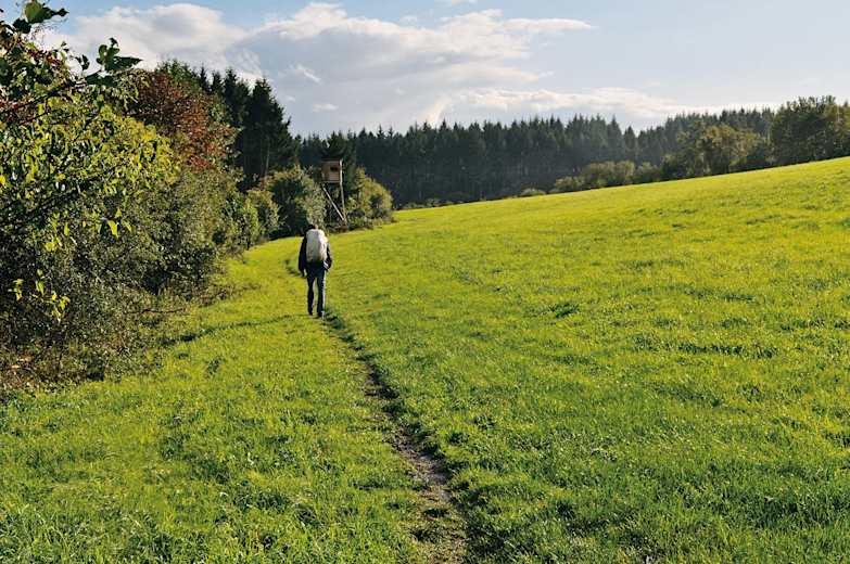 Der Saar-Hunsrück-Steig setzt sich halbrechts auf einem längeren Steg fort. Danach steigt er leicht an und endet bei einem Fahrweg. Nun wandern wir für einige Zeit im Wesentlichen geradeaus, bis die Markierung beim blauen Kilometer-Täfelchen »44« nach links auf einen schmalen Pfad weist. Dieser führt zu einem weiteren Fahrweg, auf dem wir, uns erneut links haltend, bald den Waldrand bei Britten erreichen. 1.30 Std. ab Rastplatz im Saarhölzbachtal. Wer nach Britten möchte, geht hier nach rechts und erreicht gleich einen offiziellen Abholpunkt und wenig später das Dorf selbst.
