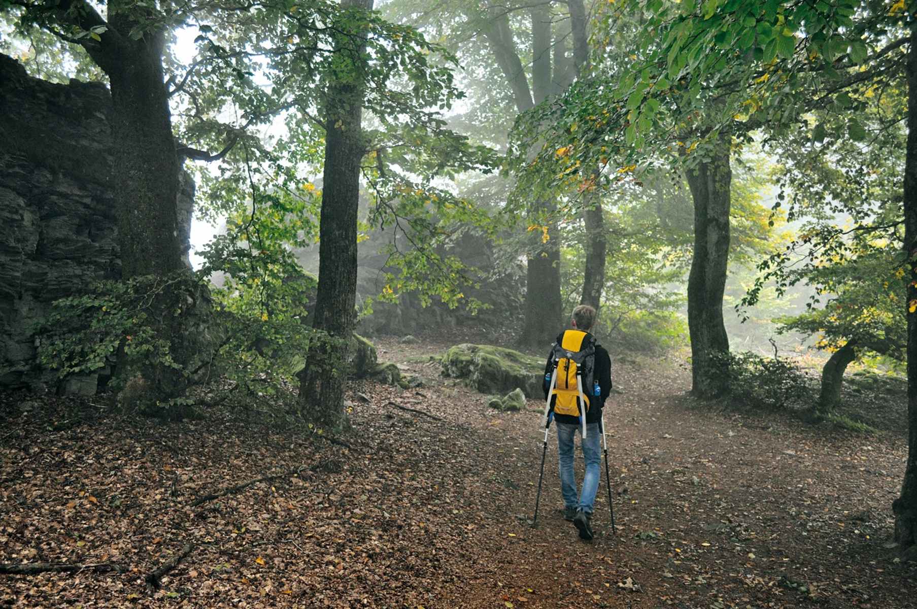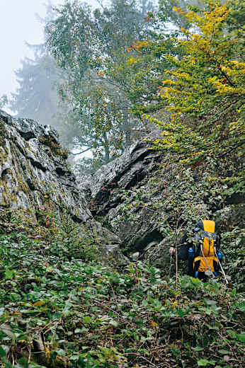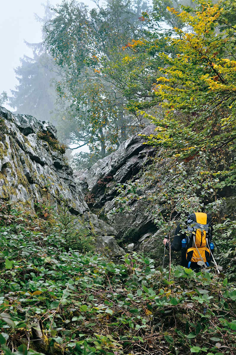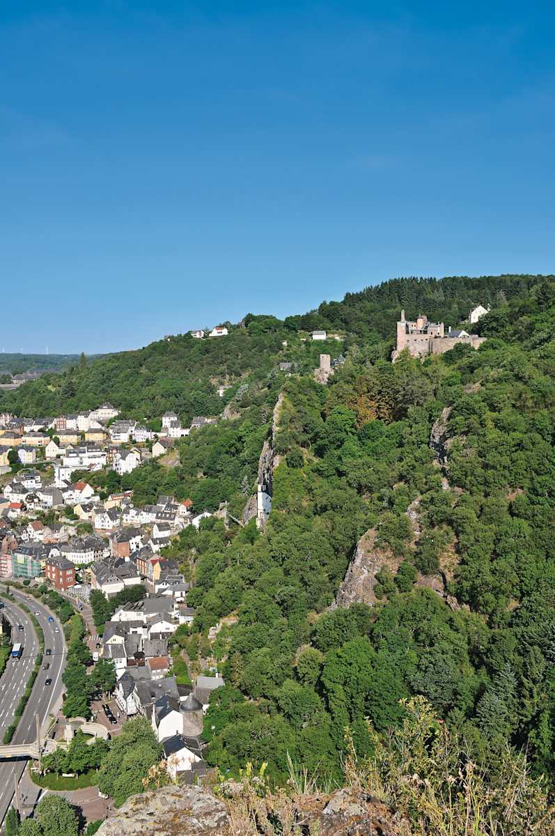 Triumphgefühle können sich einstellen, wenn man gegen Ende der Etappe zum ersten Mal jäh unter sich die Altstadt von Idar-Oberstein erblickt, zu deren Marktplatz man dann, vorbei an der berühmten Felsenkirche, absteigt. Aber bis es so weit ist, werden vermutlich noch einmal viele Schweißtropfen vergossen werden. Dabei ermüdet nicht einmal so sehr die Wanderung durch das Nationalparkgebiet bei der Burg Wildenstein und der Mörschieder Burr mit dem allmählichen Abstieg an den Ortsrand von Herborn, auch nicht das anschließende Schlendern durch ein liebliches Wald- und Wiesental. Aber gerade wenn man glaubt, nur noch wenige Kilometer vom Etappenziel entfernt zu sein, dann wartet der Saar-Hunsrück-Steig noch einmal mit mehreren sehr steilen An- und Abstiegen auf – die Wege sind wunderschön, scheinen aber kein Ende nehmen zu wollen. Umso größer ist dann die Freude, wenn man es letztendlich doch geschafft hat.