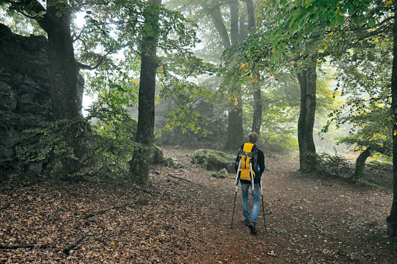 Von Kempfeld , 540 m, steigen wir auf dem vom Vortag bekannten Zubringerweg wieder hoch zum Wildfreigehege unter der Ruine Wildenburgauf dem Wildenburger Kopf , 671 m. Gut 45 Min. (alternativ kann man auch auf der morgens kaum befahrenen Straße zum Wildgehege hinaufwandern, knapp 15 Min. kürzer).