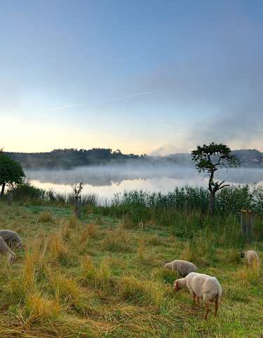 Unsere Markierung führt an zahlreichen Gedenksteinen vorbei, hält sich am hinteren Ende des »Gästebuchs« links und gleich wieder rechts in ein flaches Wiesental, wo nach etwa 700 m der große, auch Wanderern offen stehende Rastplatz der Anglerfreunde Veitsrodt, 407 m, erreicht wird. 20 Min. ab Parkplatz »Steinernes Gästebuch«. Das Plätzchen an einem Teich ist ausgesprochen lieblich und bildet einen starken Kontrast zur herben Landschaft der Hunsrück-Hochregionen.