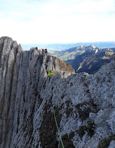 Abstieg zur Chärpfscharte (2.644 m), dieser ist zum Teil mit Fixseilen gesichert. Weiter über das Geröllband Richtung P.2612 absteigen und über die Geröllhalde gegen P.2515 queren. Durch eine Nische am Beginn des Südgrates auf den Grat und diesem in direkter Linie zum Gipfel des Grossen Kärpf (2.793 m) folgen. 2 Sicherungsstangen erleichtern an dieser schwersten Stelle (T6) den Weg.