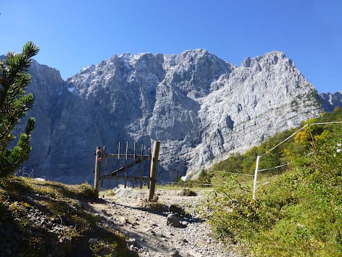 Nun heißt es über 500 Höhenmeter stetig, nie zu steil aufzusteigen. Der Weg führt unschwierig durch Wälder, über Wiesen und über kleinere Bachläufe, immer wieder gibt es phantastische Ausblicke auf die Karwendelwände über dem Talschluss des Engtals.