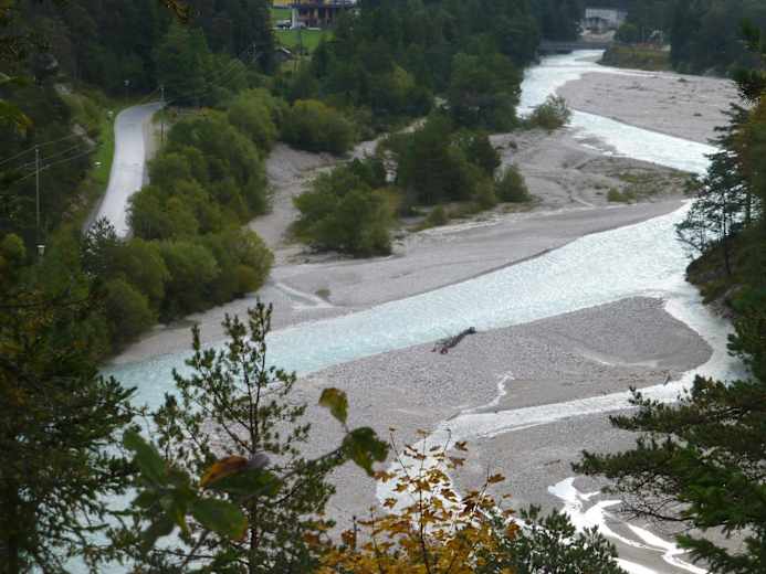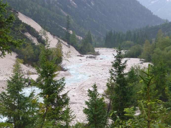 Leider wurde die Larchetalm wegen Baufälligkeit geschlossen und sie wird auch in absehbarer Zeit nicht wieder öffnen. Aber die flachen Böden rund um die Alm und der schön mäandrierende Karwendelbach laden zum Verweilen und auch zum Plantschen (Achtung Wildwasser) ein.