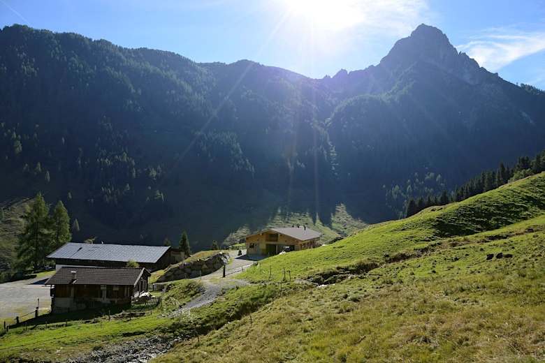 Vom Gasthof Steinberg wandert man taleinwärts rund einen Kilometer bis zum Ende der asphaltierten Straße. Hier, bei der 2. Brücke, beginnt der Steig zur Scheibenschlagalm und zur Hintenkarscharte. Über Alm- und Waldgelände gewinnt man schnell an Höhe und erreicht bald die Scheibenschlag Niederalm auf 1.446 m.