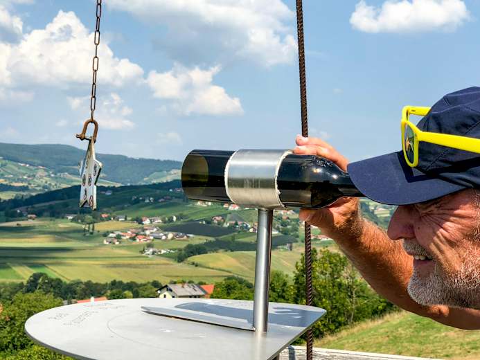 Bald erreicht man die Aussichtswarte Frutten-Gießelsdorf, von der aus man einen wunderbaren Blick auf die Weingärten genießt. Außerdem trifft man hier auf den „Weinweg der Sinne“, der bis nach St. Anna im Aigen führt.
