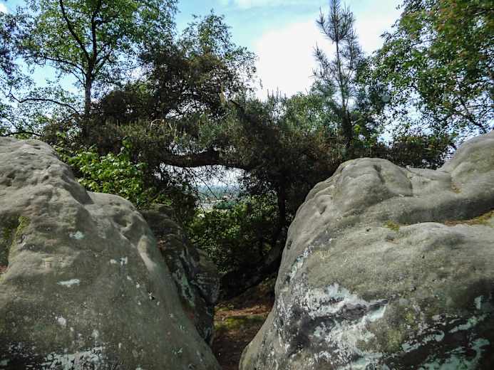 Noch ein paar Stufen bergauf, dann rechts dem Teutokamm auf dem Hermannsweg folgend, vorbei am Rastplatz Wilhelmsruh. Kurz danach zweigt ein kleiner Pfad vom Hermannsweg rechts ab. Diesem folgend führt der schmale Weg im stetigen Auf und Ab zu eindrucksvollen Felsen an der Hangkante.