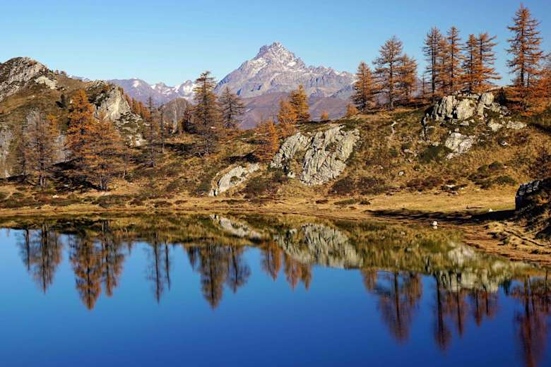 Der idyllische Bergsee Lago Nero ist herrlich eingebettet in einer grandiosen Berglandschaft, mit tollem Ausblick auf die Rocca La Meja und den Monviso. Im Herbst mit Färbung der Lärchen ist er ein echtes Highlight des Valle Maira im Piemont.
