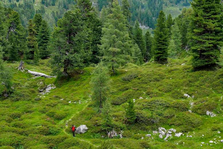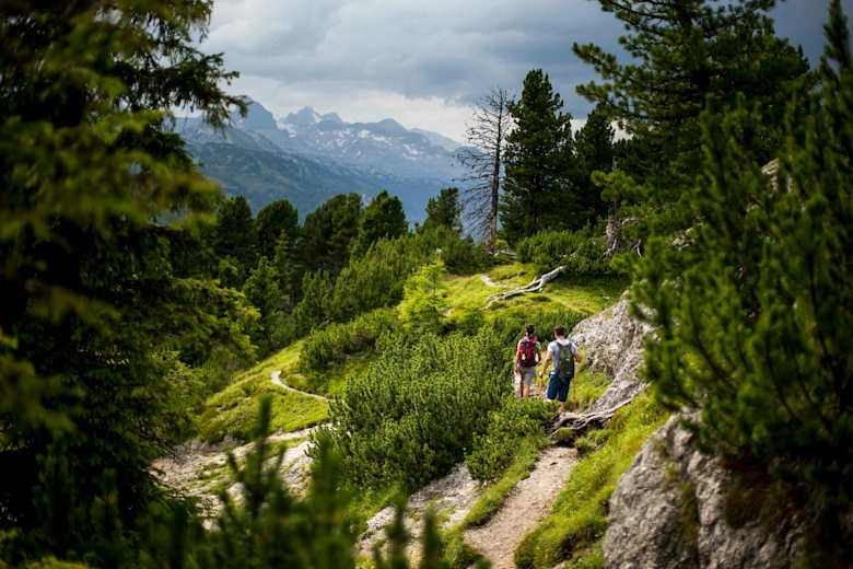 Abwechslungsreich durch kleine Wälchen, über Blumenwiesen und Felsgruppen geht es weiter und durch den Brandner Urwald zur umbewirtschafteten Brünnerhütte. Nun sind es nur noch rund 20 min, bis man kurz unter dem Gipfel des Stoderzinken den Gasthof Steinhaus erreicht, der sich für eine Nächtigung anbietet. Alternativ kann man auch auf der Ritzingerhütte übernachten, die auf dem weiteren Weg der Etappe 3 liegt.