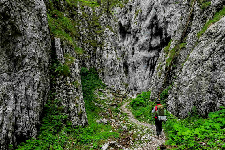 Vom Fuße des aussichtsreichen Stoderzinken wandert man abwärts durch einen schönen Lärchenwald bis zum Beginn der Notgasse. Die gut beschilderte Abzweigung befindet sich in der Talsohle.