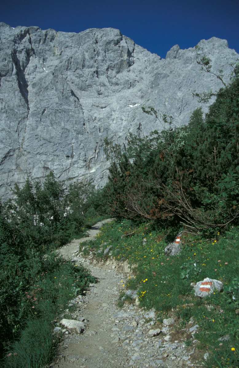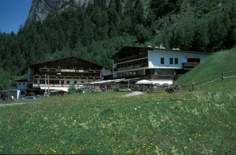 Aber der Weg führt ohnehin bald weiter. Kurz vor dem Alpengasthof Eng zweigt ein schmaler Steig recht ab, der zur Forststraße 456 führt. Dieser folgt man nach Osten bis zum Binsalm-Niederleger. Weiter über den Binsalm-Hochleger wird es nun rasch wieder ruhiger und man wandert stetig aufwärts durch die herrliche Karwendel-Landschaft bis zum westlichen Lamsenjoch auf 1.940 m.