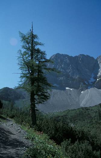 Fast eben geht es nun über den schmalen Steig zum östlichen Lamsenjoch und in wenigen Minuten zur Lamsenjochhütte auf 1.953 m, die unterhalb der mächtigen Lamsenspitze, 2.508 m, steht.