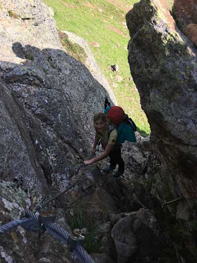 Unterhalb der Äußeren Wetterspitze mit 3.070 m führt der Höhenweg geschickt durch die Felswände der Hohen Burg ins Plattental. Weiter durch den weiten Kessel der Traulalm schlängelt sich der Weg immer wieder durch felsige Passage, die zum Teil mit Drahtseilen versichert sind.