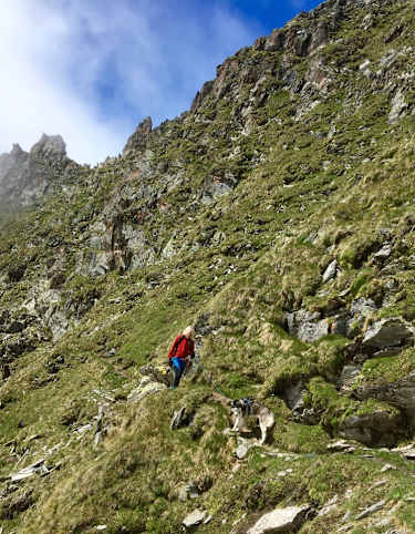 Durch die Kugelwand steigt man auf Weg Nr. 7 zum Kalbenjoch auf 2.225 m ab. Hier nimmt man nun den Weg Nr. 13, der zur Peilspitze, 2.392 m, führt. Hier sind wieder einige seilversicherte Passagen zu bewältigen.