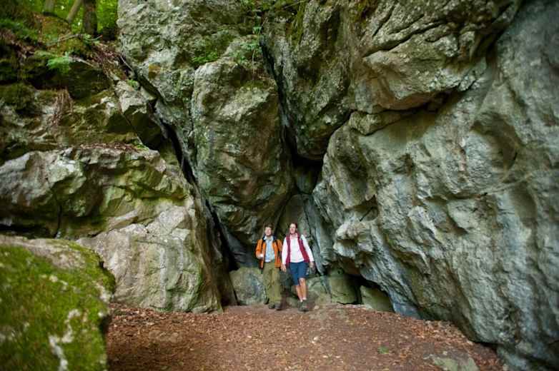 Kurz danach erreicht man die Große und die Kleine Steinkammer. Es handelt sich dabei um Höhlen, die in vorgeschichtlicher Zeit Menschen als Wohnraum dienten. Am Rande eines Steinbruchs geht es weiter bis zum Eingang der Tropfsteinhöhle „Herbstlabyrinth“, die im Jahr 2009 eröffnet wurde. Die Höhle wird komplett mit LED-Lampen beleuchtet und ist damit die einzige ihrer Art in ganz Europa. Von der Höhle ist es jedenfalls nur noch ein Katzensprung zum Etappenziel Breitscheid.