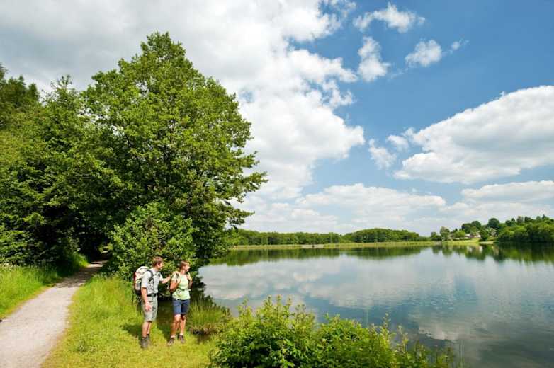 Auf einer feuchten Wiese geht es hangabwärts zum Heisterberger Weiher. Besonders im Sommer füllen sich seine Ufer mit Menschen, die zum Baden gekommen sind oder sich ein Boot für eine Spritztour übers Wasser ausleihen. Es gibt auch einen modernen, ganzjährig geöffneten Campingplatz mit sanitären Einrichtungen (behindertengerecht), Kinderspielplatz und Volleyballfeld, Kiosk und Gaststätte. Am Heisterberger Weiher begegnest du wieder dem Amdorfbach. Am Ufer des Sees entlang führt der WesterwaldSteig bis zur Straße nach Heisterberg.