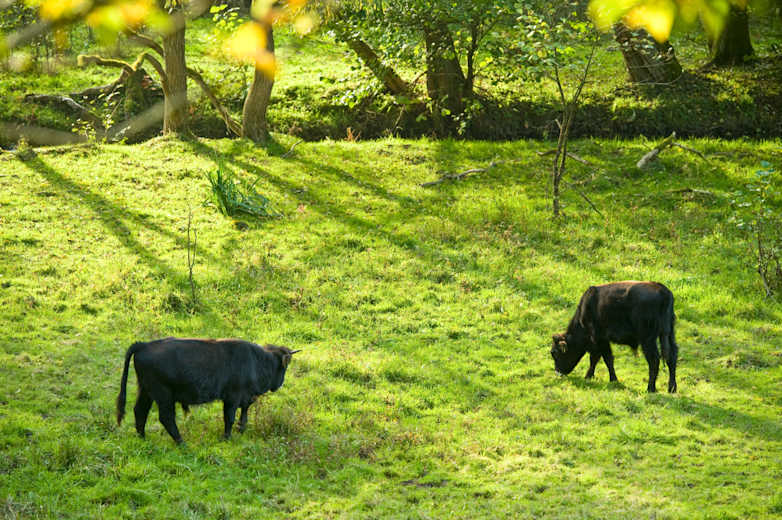 Wenig später durchwandert man auf dem Weg zum Etappenziel Horhausen selbst das Grenzbachtal. Heckrinder, eine alte Rinderrasse, darf hier gemütlich grasen und hält das Tal von Bäumen und Sträuchern frei.