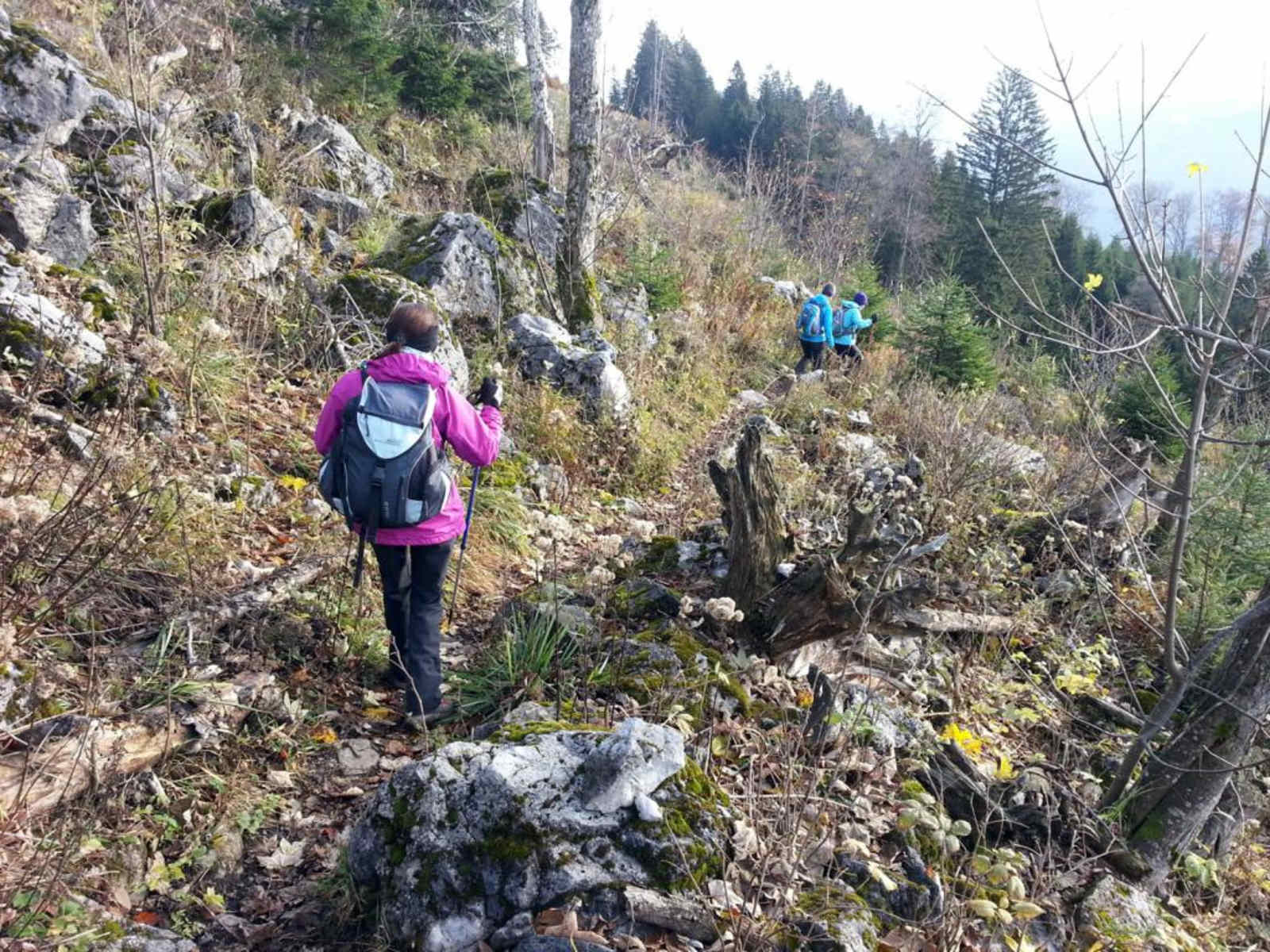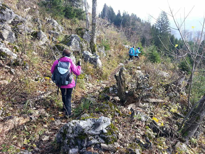 Auf einem alten Karrenweg den Hang hinauf bis zu einem breiten Kamm, den man nach links verfolgt. Vorbei an einem neuem Wegkreuz zu einer Jagdhütte und dahinter auf einem Fahrweg ziemlich eben zu einer markanten Kurve.