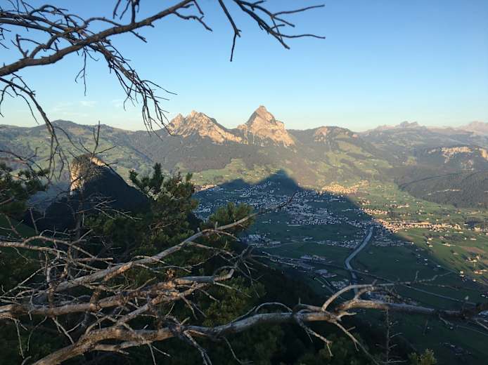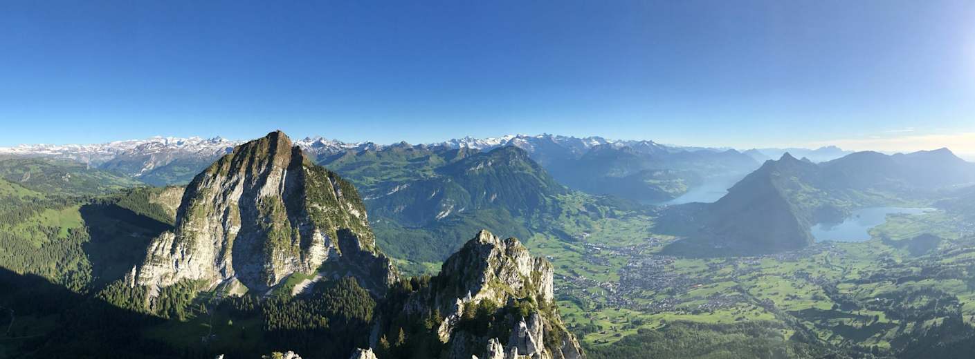 Oben angelangt sind die Mühen des Aufstiegs ob der atemberaubenden Aussicht schnell vergessen: tief unten im Tal ruht der Schwyzer Talkessel, die Zentralschweizer Seen und die Weite des Mittellandes. Nachdem man sich dann satt gesehen hat, beginnt der Abstieg zurück zur Holzegg. Von dort geht es über Gspaa hinab nach Brunni zur Talstation der gleichnamigen Bahn.