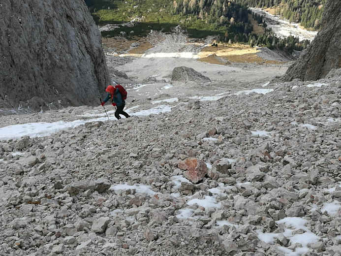 Von der Panascharte steigt man an der Nordseite steil (Markierung Nr. 6) über kurze versicherte Passagen in Richtung Brogleshütte hinab. Unterhalb der Felswände biegt man bei einer Abzweigung (die man leicht übersehen kann!) nach rechts ab und folgt dem Weg Nr. 6A, der in den „Adolf Munkel Weg" (Markierung Nr. 35) einmündet. Man folgt den schönen Höhenweg bis zum Abzweig Gschnagenhardtalm-Geisleralm, den man vom Hinweg kennt und folgt dem Weg Nr. 34 zur Gschnagenhardtalm (2.006 m) und wenig Meter leicht abwärts zur Geisler Alm (2.000 m).