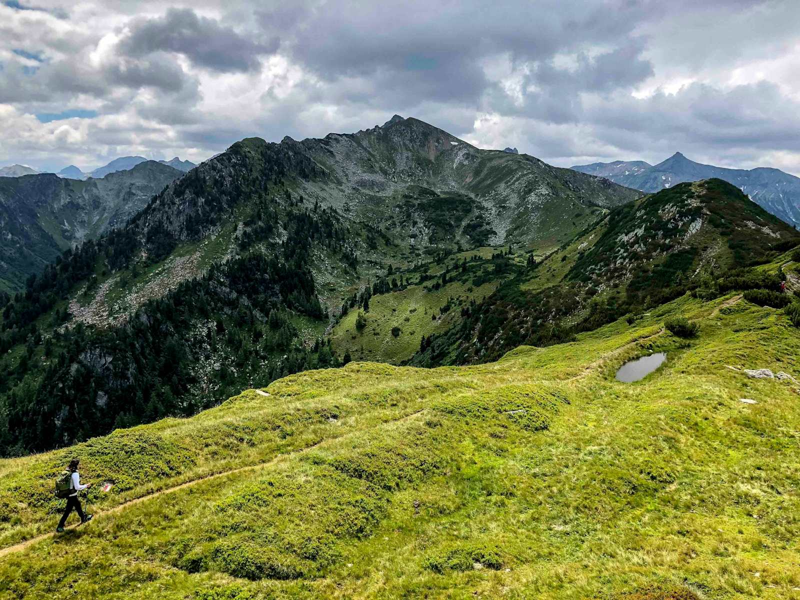 Von der Hochwurzen wandert man über den aussichtsreichen Höhenrücken weiter. Man erreicht das Rossfeld mit 1.919 m und bald drauf die Guschen mit 1.982 m. Von ihrem Gipfel genießt man eine herrliche Aussicht über die Schladminger Tauern. Weiter geht es über Schneider, Hochfeld und Schiederck auf über 2.000 m hinauf. Östlich vorbei an der Kampspitze erreicht man den Brettersee, wo nun der Abstieg zur Ignaz-Mattis-Hütte beginnt.