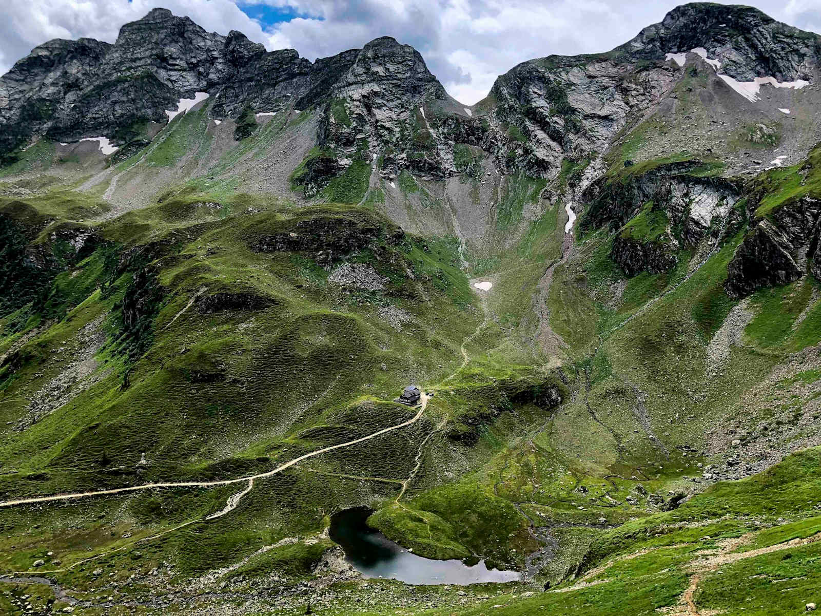 Über die Kruckeckscharte geht es in vielen Kehren abwärts ins Neualmkar, wo sich die Keinprechthütte und damit das heutige Etappenziel befindet.