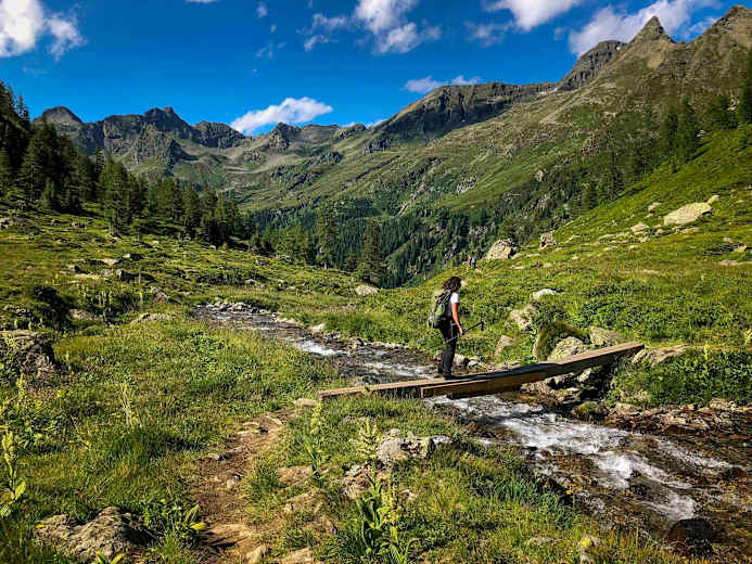 Man quert den Waldhornbach und folgt dem Zentralalpenweg 02 weiter bis zur Preintalerhütte, dem Ziel dieser Etappe.