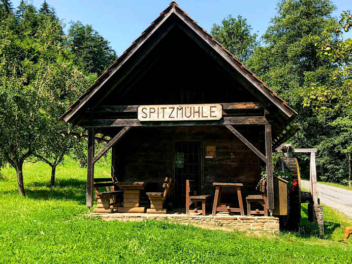 Die Spitzmühle ist eine nach alten Plänen wieder errichtete Schauwassermühle, die man selbst erkunden kann.