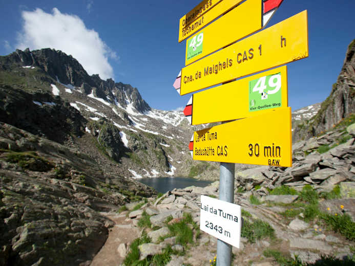 Man passierte den Fuss des Badus und kann schon den Lai da Tuma oder Tomasee (2.345 m) erspähen. An der Weggabelung folgt man dem offiziellen Vier-Quellen-Weg, Route Nr. 49 Richtung Tschamut/Sedrun – Tomasee.