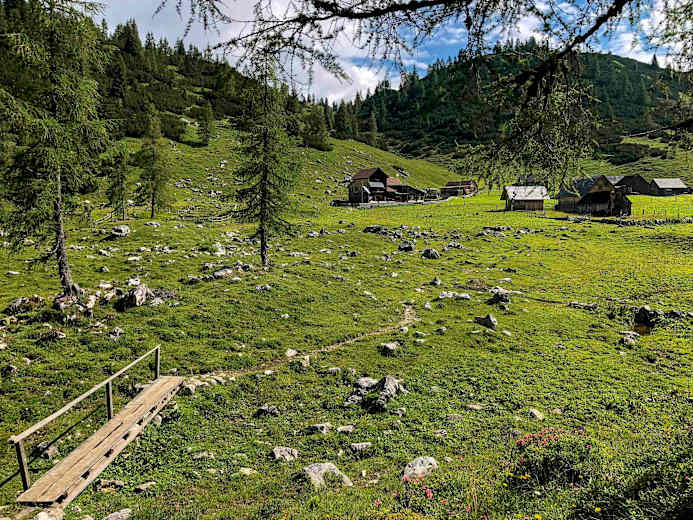 Von der Hochmölbinghütte wandert man über Almgelände und einen schönen, lichten Lärchenwald aufwärts zum „Gott sei Dank“-Bankerl. Auch hier genießt man noch einmal einen sehr schönen Ausblick zurück zum Dachstein.