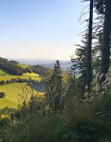 Durch Wälder, über Wiesen und vorbei an Höfen und Häusern wandert man nun abwärts nach Pöllau. Auf der gegenüberliegenden Talseite kann man bereits die bekannte Wallfahrtskirche Pöllauberg ausmachen, die man auf der kommenden Etappe besucht.