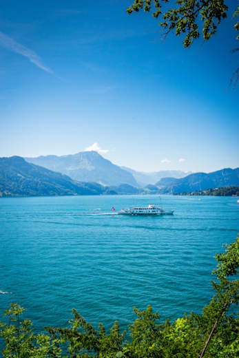 Sicht auf Vierwaldstättersee und Kursschiff während der Wanderung entlang des Waldstätterweg, Etappe 3 Küssnacht-Luzern Foto: Outsideisfree.ch