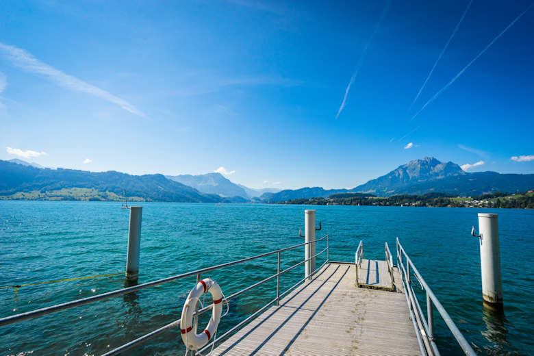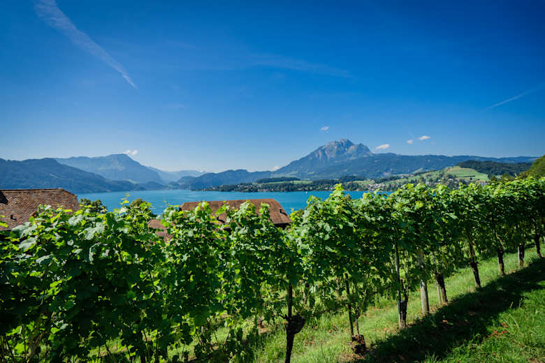 Ab dem beschaulichen Ort Meggen verläuft die Tour am nördlichen Ufer des Vierwaldstättersees. Am Rand des Weges erhebt sich das schöne Schloss Meggenhorn, im Hintergrund thront der imposante Hausberg von Luzern: der Pilatus.