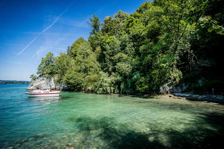 Sicht auf Ufer und Boot während der Wanderung entlang des Waldstätterweg, Etappe 3 Küssnacht-Luzern Foto: Outsideisfree.ch