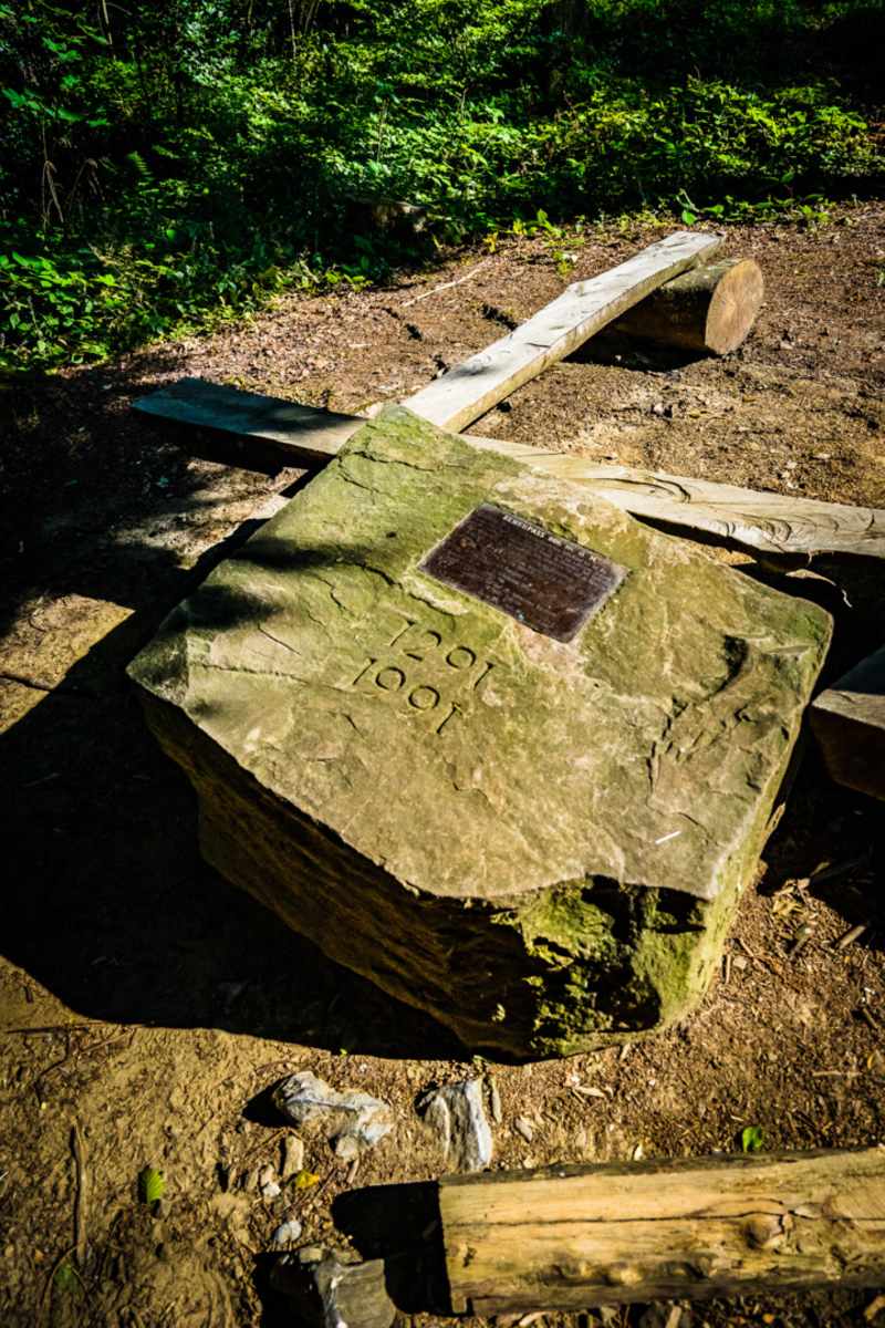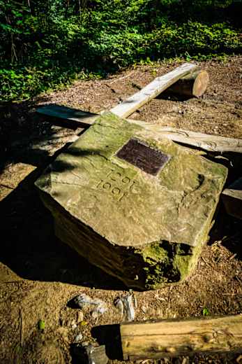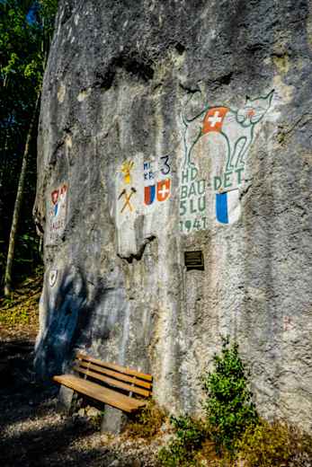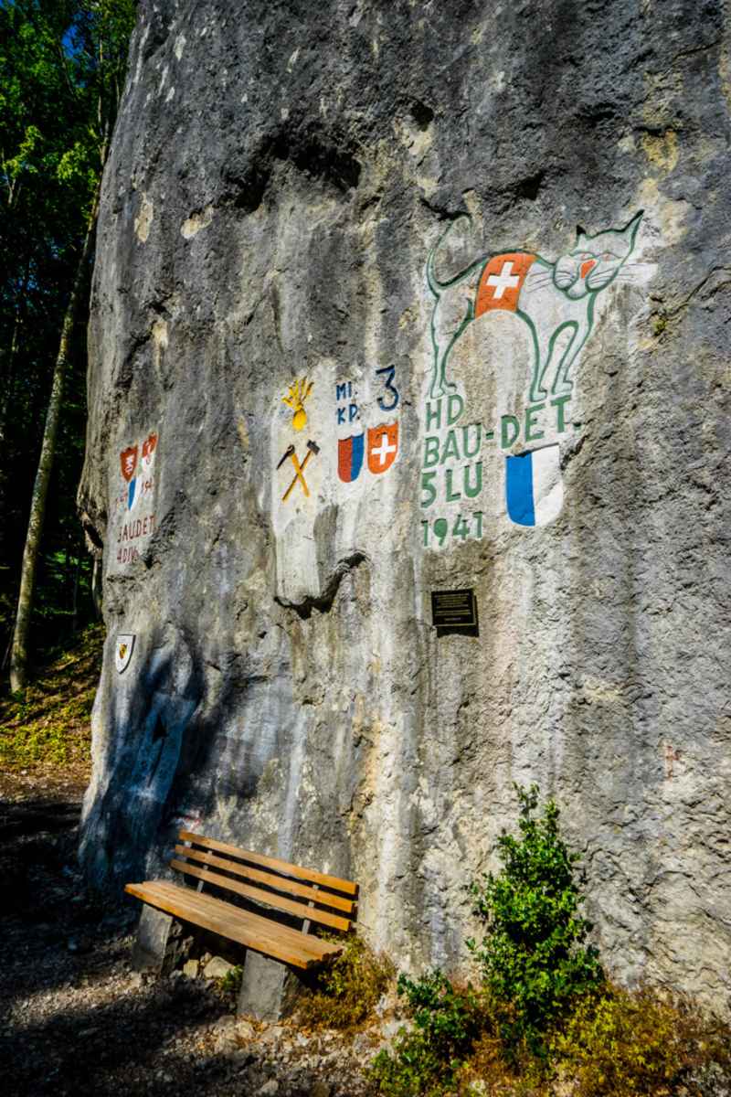 Sitzbank und Felsmalerei auf der Wanderung entlang des Waldstätterweg, Etappe 4 Luzern-Alpnachstad Foto: Outsideisfree.ch