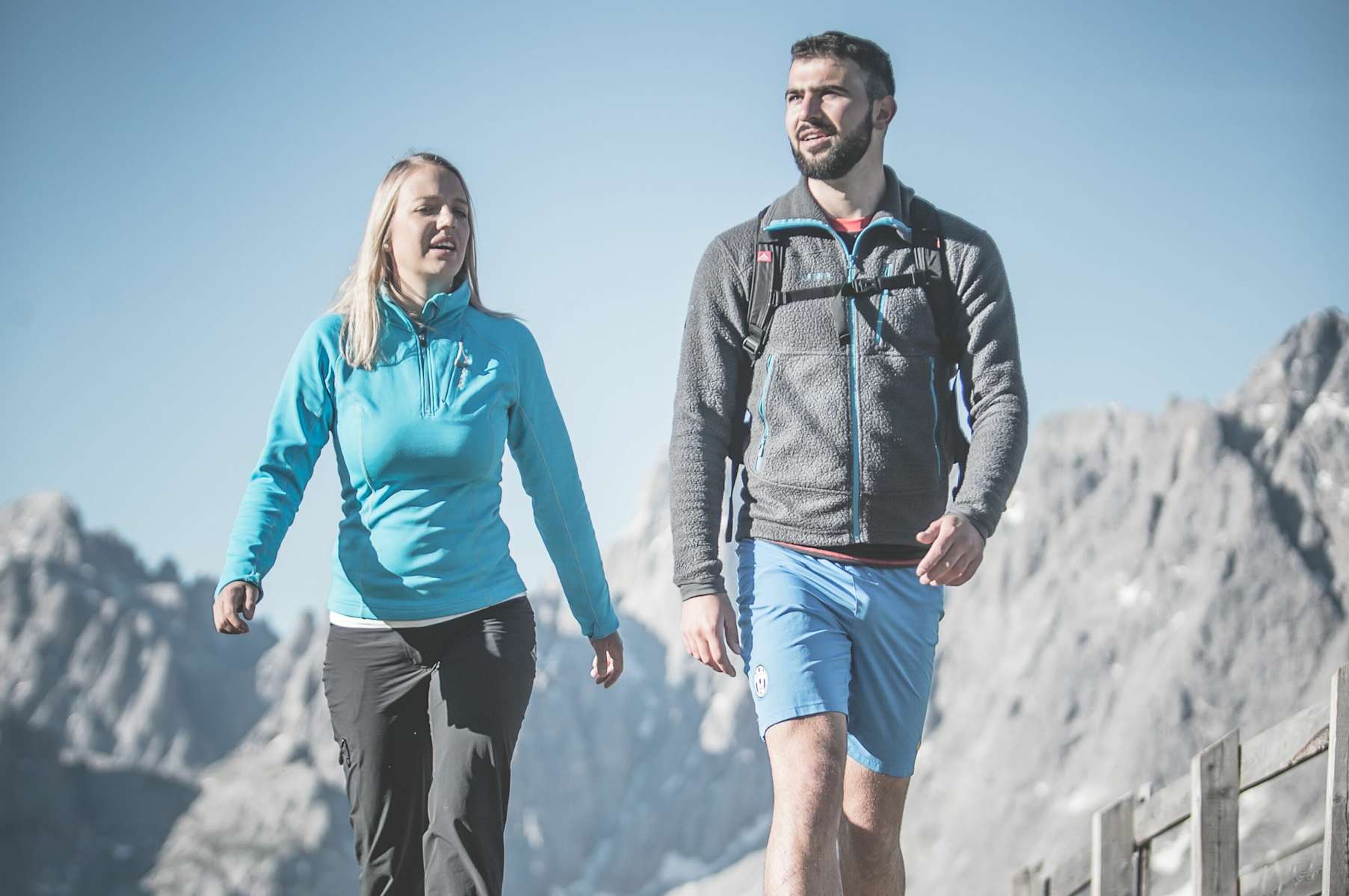 Mit der Seilbahn geht es hinauf zur Bergstation der Rotwandbahn, wo die Rotwandwiesen Hütte und die Rudi Hütte zur Einkehr einladen, noch bevor die Tour richtig begonnen hat. Das Panorama auf die Dreischusterspitze ist aber in der Tat so beeindruckend, dass sich eine Rast auf jeden Fall lohnt.