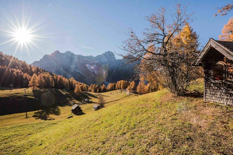 Danach wandert man über die schönen Lärchenwiesen - die vor allem im Herbst ihre ganze Pracht ausspielen - entlang von Weg Nr. 15 Richtung Norden auf die Rotwand zu. An der Wegkreuzung hat man nun die Wahl, ob man auf Weg Nr. 15 B westlich des Burgstalls vorbei geht (einige Höhenmeter mehr), oder auf Weg 15 unterhalb. Beide Wege treffen unterhalb der mächtigen Sextner Rotwand wieder aufeinander. Auf Weg Nr. 15 geht es im Anschluss hinunter zum Kreuzbergpass.