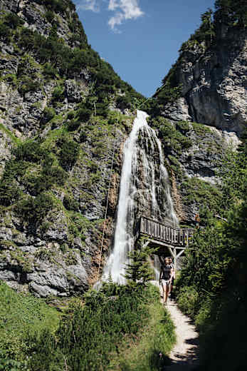 Die Wanderung von der Erfurter Hütte über die Dalfaz Alm und den Dalfazer Wasserfall im Rofan in Tirol hoch über dem Achensee ist vor allem durch die herrliche Aussicht auf das Karwendel und Tirols größten See gekennzeichnet. Zudem geht es hauptsächlich abwärts, dies zum Teil aber auch relativ steil.