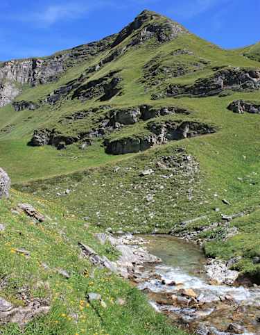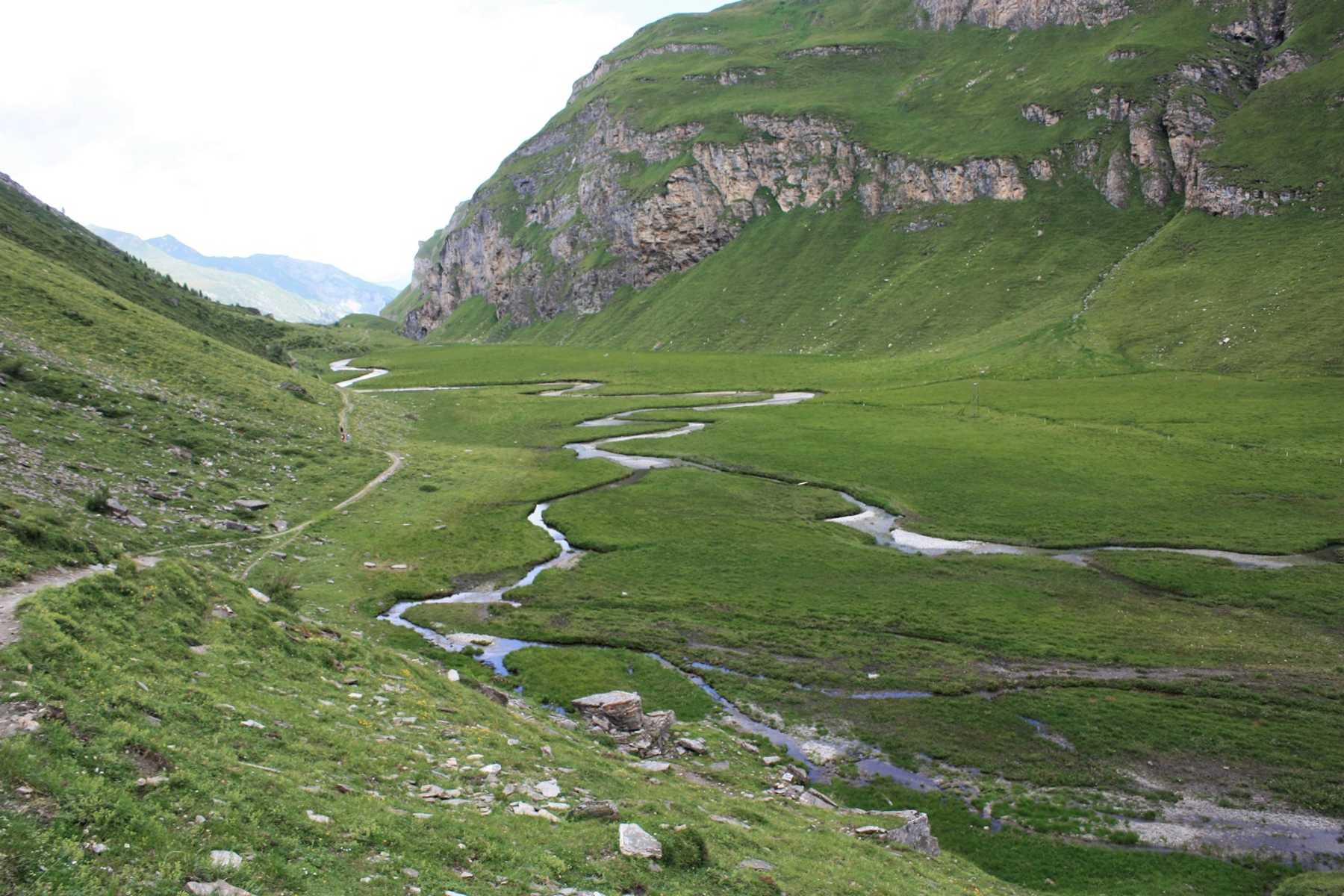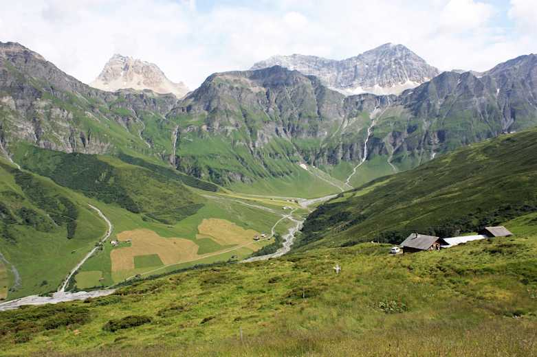 Bald lässt man den schattenspendenden Wald hinter sich und wandert vorbei an den zahlreichen Wasserläufen, die den Riedboda durchziehen. Wenig später lädt die Alp Tomül lädt ein zu einer kleinen Stärkung, bevor es in angenehmer Steigung auf den gleichnamigen Pass (2.411 m) hinauf geht.