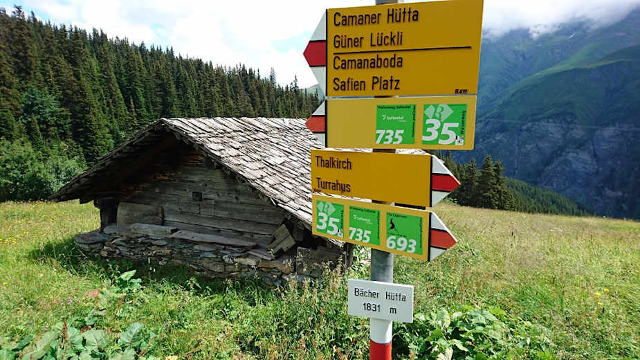 In Thalkirch beginnt der Anstieg über die Heuwiesen bei den Bächer Hütten zum romantischen Camanerwald. Wenig später wird die Camaner Hütta erreicht, ein guter Zeitzeuge der einst im Safiental verbreiteten Einzelsennerei.