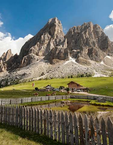 Dank Seilbahnunterstützung leichte Wanderung zum Friedrich-August-Hütte, die am Fuße des Langkofels in herrlicher Aussichtslage steht.