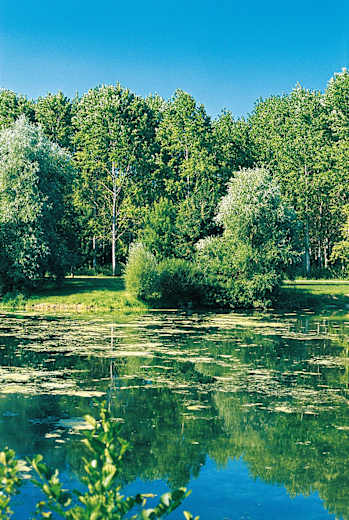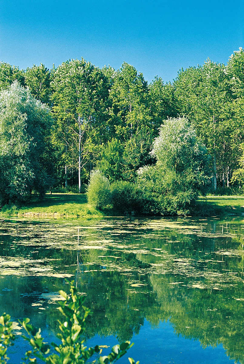 Am Beginn eines Pappelwäldchens biegen wir links ab und wandern auf einem teilweise verwachsenen Weg nach Süden durch das Wäldchen, wobei wir in diesem Abschnitt sorgfältig auf unsere gelben Zeichen achten. So erreichen wir nach gut 250 m einen malerischen Baggersee und gehen rechts auf einem breiten Wiesenweg an seinem von Bäumen gesäumten Ufer entlang bis zu seinem Ende, wo wir nach links weiter an seinem Ufer bleiben. Kurz vor dem südlichen Seeende geht es nach rechts zu einem Teersträßchen und auf ihm nach links zur schon bekannten D 214. Auf ihr wandern wir nach rechts über Wiesen und Weiden bis zum Ornain.