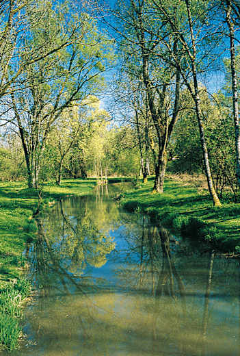 Unser Weg führt nun in der Nähe des Sees am Rand von Wiesen und eines Wäldchens entlang bis zu einer schmalen Teerstraße bei einem Steinkreuz nur ein paar Meter von der D 141 b entfernt. Wir biegen hier rechts ab und wandern auf Asphalt über eine Brücke, die einen malerischen moorigen Bach überspannt.